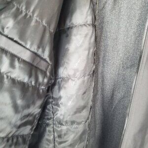 Inside and outside pockets, lining is both quilted and cozy knit, exterior is wind breaker poly fabric