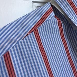 Brand new! Never worn. Features striped detailing in blue, white, black and red!
