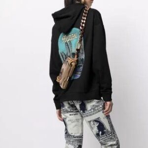 Long sleeve French terry hoodie in black. Drawstring at hood. Kangaroo pocket at waist. Logo, crystal-cut appliqués, and graphic printed in multicolor at back. Rib knit cuffs and hem.Supplier color: Skyscraper