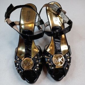 Michael Kors Black Patent Lthr Platform Open Toe Buckle Ankle Strap 5" Heel wmn's sz 10M. Golden studs. Big golden MK Logo. Condition is "Pre-owned". Shipped with USPS Priority Mail. 177.1 pem