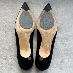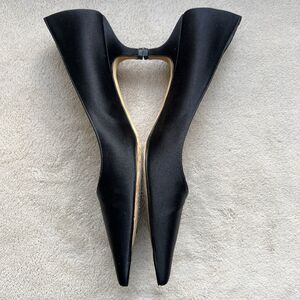 This pair of sleek Michael Kors satin pumps. feature a classic pointed toe and a chic kitten low heel. These black heels are the epitome of sophistication. The slip-on style makes them easy to wear, while the lightweight design ensures all-day comfort. Perfect for any occasion, from workwear to weddings, these pumps are a versatile addition to any wardrobe. Made in Italy, they boast high-quality craftsmanship and a timeless design that will never go out of style. Add a touch of luxury to your look with these minimalist, designer heels.