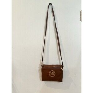 This Michael Kors Jet Set Travel Crossbody bag is perfect for any woman on the go. The camel colored leather and PVC exterior is complemented by a beige lining and brown leather handle/strap. The bag features a zip closure and plenty of pockets for all of your travel essentials. The bag also includes a stylish Michael Kors logo charm and is part of the Michael Kors Jet Set Crossbody bag product line. Whether you're running errands or traveling, this crossbody bag is a must-have.