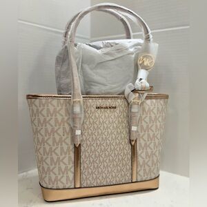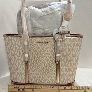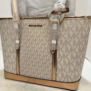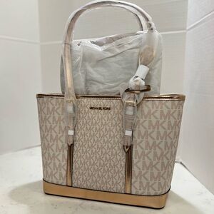 Chic tote with signature MK design. Cream and gold accents. Ideal for any occasion.