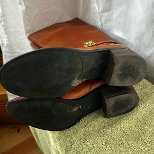 Michael Kors "Hamilton" luggage (light brown) riding knee high vachetta leather boots, with bright gold tone Michael Kors logo padlock detail, and zipper pull. Size 7m. Stacked 1.5" heel. Partial zippered closure on the inner side. Strap detail at the base of the shaft. Beautiful Michael Kors boots. Darkened area, possibly water spot on the left toe area as seen in pics.