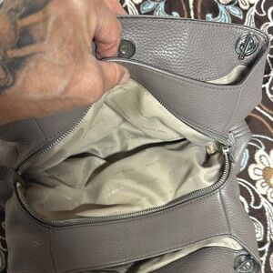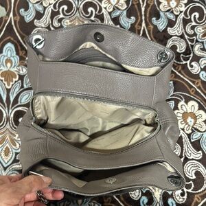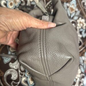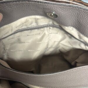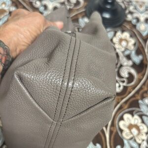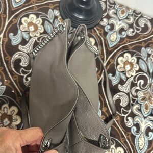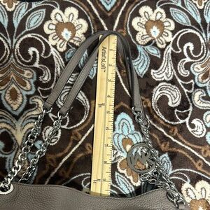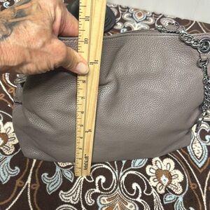 This Michael Kors shoulder bag features a sophisticated gray leather design with stylish silver chain straps. Its medium to large size and slouchy shape offer both elegance and practicality, making it a versatile choice for any occasion. See all photos as they are part of description