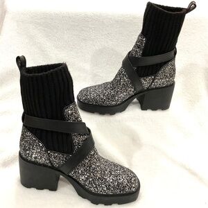 BLACK MICHALE KORS KEISHA LEATHER CHUNKY COMBAT PULL ON SILVER GLITTERED LUG SOLE BUCKLED SOCK BOOTIES SIZE 7.5