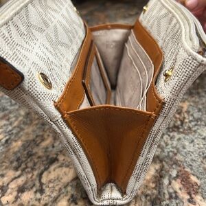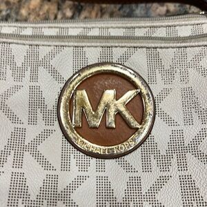 This bag is in excellent condition except Michael Kors emblem has a few places on it. Please see a photo. Beautiful bag. Excellent on the inside. No stains. No scratches on the leather strap is in perfect condition.. adjustable..Same day shipping. 7.5” by 6.25”