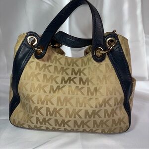 Michael Kors Ludlow Lrg Signature Satchel Bag Drawstring Brown Canvas Blue Leather