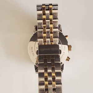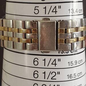 Michael Kors ladies watch with mother of pearl face and two-toned band. Links have been removed and I don't have them so be sure to check the picture with the size. In very good condition with only minor scratching on the band. Currently running with a fresh battery.