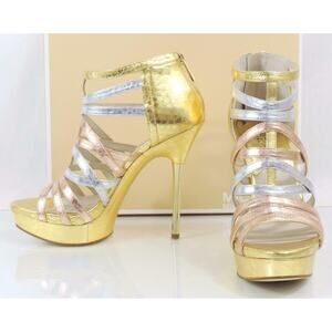 - Dazzle your footwear collection with these metallic embossed leather stilettos by Michael Kors designed with an open toe ,a strappy vamp and a platform heel
