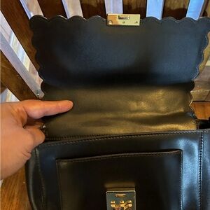 Chic black satchel with scalloped edges. Features silver MK logo. Perfect for everyday elegance. EUC. Only used a few times. Please see pics for meausrements.