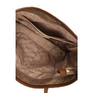 This Michael Kors nylon tote is a lightweight and spacious everyday carryall in a classic tan color with brown faux leather trim. Features a full top zipper, durable double shoulder straps, gold-tone hardware, and signature MK monogram lining.