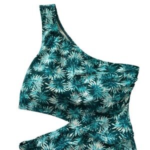 Stylish one-shoulder swimsuit with a aqua blue green leaf print. Perfect for a chic beach look.