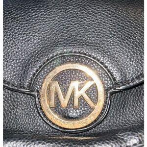 The Michael Kors Pebble Leather Crossbody Small in Black with Gold Logo is a stylish and practical handbag designed for women. Crafted from luxurious leather with the signature MK logo pattern inside on the lining, this small crossbody bag features a snap closure and a pebbled finish. The gold accents, including the crossbody strap handle, add a touch of luxury to the design. The adjustable strap provides convenience and versatility, while the lined interior ensures your belongings are secure. There is a snap pocket in back and small zippered pocket inside. Perfect for everyday use, this designer handbag combines fashion and function seamlessly. It is clean inside and out. It measures 8” across and 6.5” tall.