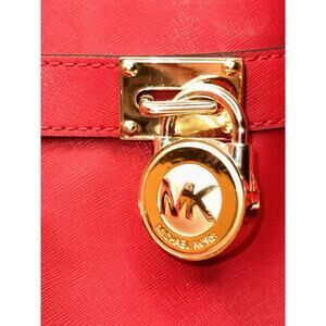 The Michael Kors Red Hamilton Handbag is a stylish and spacious square-shaped shoulder bag. Made of leather with gold-plated hardware accents, it features double red handles and a beige leather lining. This large handbag has a spacious interior with inner pockets, an adjustable and chain strap for versatility, and a buckle accent detail. It also comes with a bag charm, original dust bag, and a lock for added convenience. Perfect for any fashionable woman looking for a chic and practical accessory.