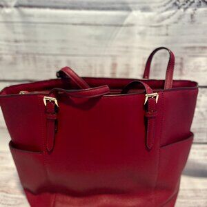 Michal Kors shoulder tote bag in red with gold hardware. Dimensions are 11.5" wide x 11" tall x 5" wide with a 21" handle. There is a middle zipper pocket and 2 side internal pockets without a zipper. There is also an attached keyring on the inside. The outside has 2 side pockets for keys or a phone and they do not have a zipper closure. This is a beautiful bag, great color, and well loved.