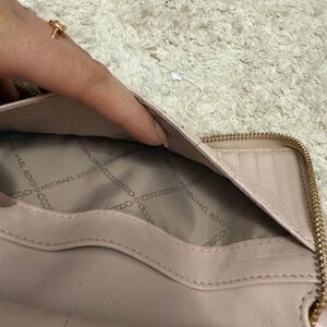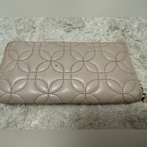 This sophisticated Michael Kors wallet showcases a luxurious quilted design in a rich tan hue. Crafted with precision, the overlapping circle pattern adds a touch of elegance and texture. The smooth leather finish and subtle metallic logo detail complete its refined look.