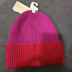 Michael Kors Women's colorblocked print Plaited Fisherman Rib Cuff Beanie Winter Hat Pink/Red