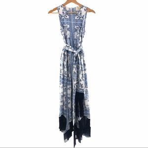Fringe-trim tie belt at waist; handkerchief contrast chiffon hem