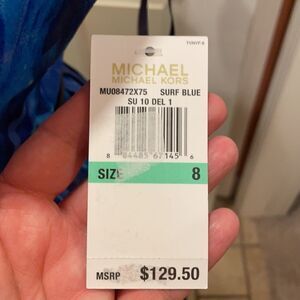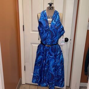 Michael Kors Surf Blue Fit & Flare dress, size 8. New with tags! pretty blue swirl design. Twist on back. Side zipper. Lined. Missing the belt.