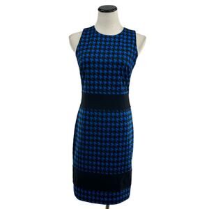 From day to night, our houndstooth sheath dress offers up optic elegance. Finished with flattering bands across the waist and hem and a sleek back zip closure, this sleeveless silhouette makes a smart statement for all manner of occasions. Playful enough for a night on the town, yet sophisticated enough for work. Color name is Amalfi blue. Blue and black colored houndstooth print. Crew neckline. Sleeveless silhouette. Back zip. Sheath style. Fitted bodice. Polyester / spandex. Machine wash. MF48VA90JR. In preowned condition.