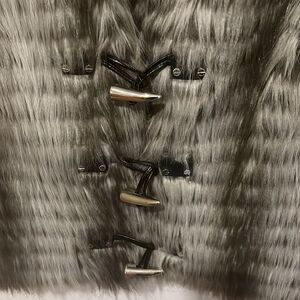 New without tags. Beautiful best with noticeable no flaws. Fun closure details on front. Super soft faux fur- black and gray. Size L. Approx measurements across Chest 20” length 24”
