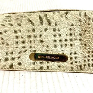 Michael kors MK signature print canvas wallet with gold tone hardware 3 compartment plenty of space leather & fabric lining open pocket at back logo at front inside have some marks back have a tear exterior minor stains hight 3.5” width 7.5”The dimensions are based on approximately measurements before placing an order please check take a moment to view all photos using feature for a closer look