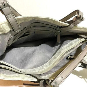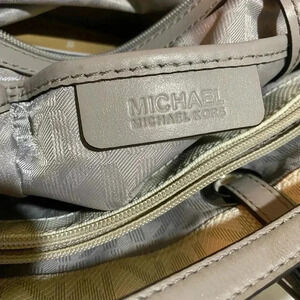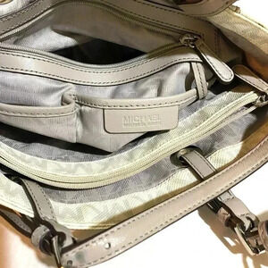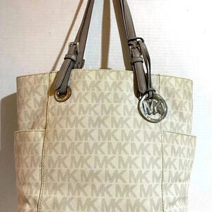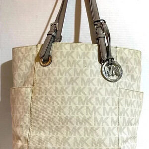 Michael kors white & gray MK signature print canvas shoulder handbag with silver tone hardware main 3 compartment zip closure at center 5 pockets at interior wall 1 zip closure jacquard fabric lining hangtag at side logo at hardware pocket at both sides exterior have minor marks stains hight 9.5” width 14” depth 5” strap drop 10”