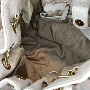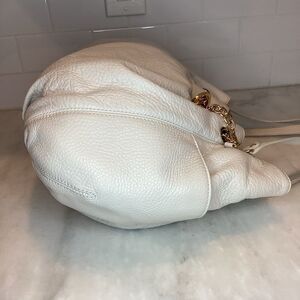 Authentic Michael Kors Jet Set Chain Ring Tote Vanilla Cream Genuine Pebbled Leather EUC. This Michael Kors shoulder bag in a pristine cream hue features a stylish ruched design, offering a chic and modern look. A gleaming metallic chain creates the slightly gathered silhouette of a sophisticated tote fashioned from rich, pebbled leather. Crafted from high-quality leather, it boasts a slouchy silhouette and a comfortable curved shoulder strap, making it a versatile accessory for any occasion. The gold-toned hardware and signature MK medallion add a touch of elegance to this timeless piece. Photos are the best description of this MK bag. Please ask questions and make an offer!!