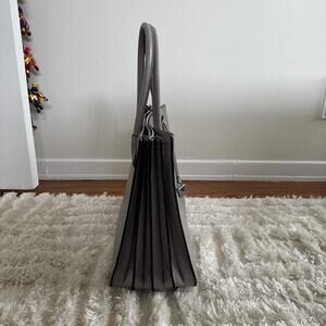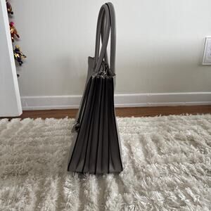 pearl grey, leather tote, designer bag, square shape, minimal design, carryall, structured, versatile, everyday bag, authentic