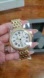 Elegant Michele watch with a gold band and diamond accents. Features a white face with black Roman numerals.