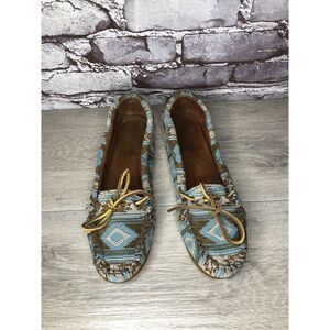 Minnetonka Blue Aztec Southwest Lace Bow Moccasins Shoes Women Sz 9M US/40EU