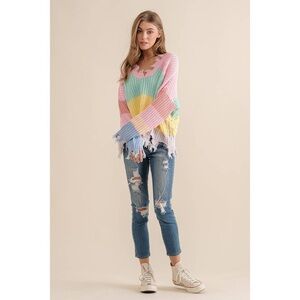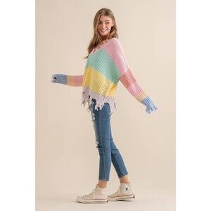 Miracle Striped Pastel Raw Hem Sweater in Multi. Features long sleeves, cropped length, v-neck, frayed raw hem. 55% cotton, 45% acrylic. Wide neckline.