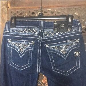 Miss Me Skinny Jeans with embellished pockets and back yoke. Dark wash with contrasting stitching