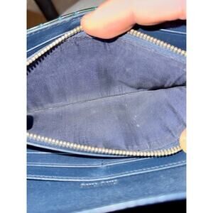 This is an authentic MIU MIU Patent Croc Embossed Continental Flap Wallet. This glossy crocodile embossed crackled patent leather clutch wallet is featured in bluish green. This long wallet features a front flap that unsnaps to a smooth dark green leather interior with patch pockets, credit card slots, and a zipper compartment. This is a fabulous everyday wallet from Miu Miu!