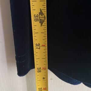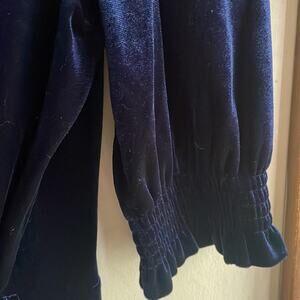 Wrap yourself up in this soft, luxurious navy blue velvet mini dress, where simple clean lines meet lush elegance. Smocked detailing at the cuffs with frilly edges allow for fabulous puff sleeves, and the adjustable tie belt cinches perfectly at the waist.