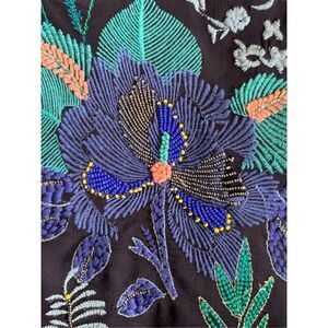 Add a touch of boho elegance with this Monsoon embroidered open-front kimono. Made from 100% viscose, this lightweight navy topper features stunning floral embroidery and hand-sewn beaded detailing in vibrant shades of turquoise, blue, and green. A patterned border adds contrast, while the relaxed fit and 3/4 sleeves offer easy layering. Fully lined. Made in India.