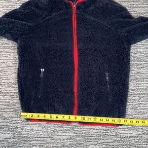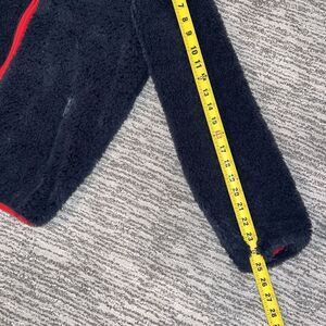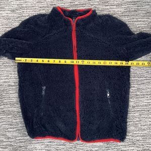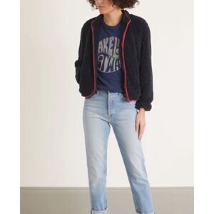 The jacket is cut from a super-soft navy sherpa with a silky, cool-to-the-touch lining and red trim along the zipper and hem.