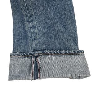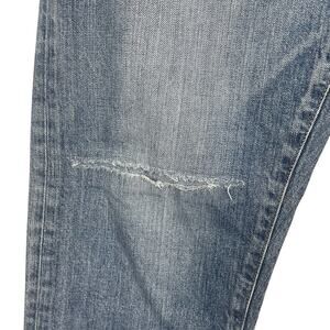 100% cotton tapered jeans with distressed knee. Selvedge denim. Button fly. Medium wash. Size 38. Please see photos for measurements.