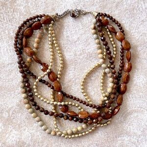 Enhance your style with this elegant boho multi-strand necklace featuring rich brown and gold tones.