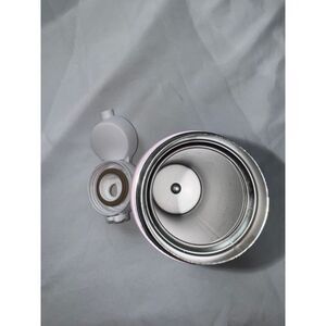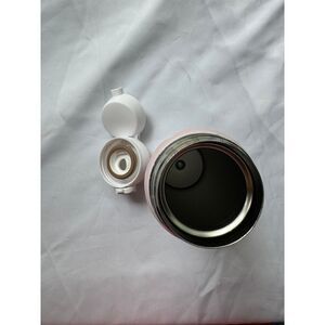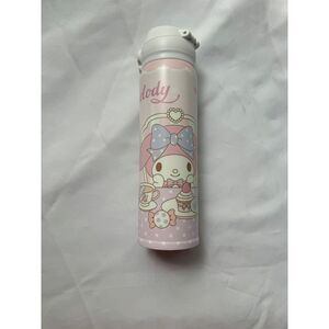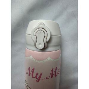 My Melody pink and white stainless steel tumbler. Screw on pop open top. Melody sitting at a table with coffee, a cupcake, and a piece of candy. Excellent preowned condition. This is not a large tumbler at approximately 16 oz. No scratches or scuffs.