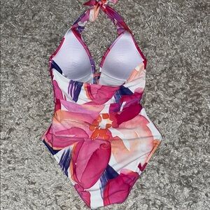 Beautiful and colorful bathing suit featuring a vibrant floral design and halter tie at the top. The fabric cinches in the waist to make a very flattering hourglass shape. Perfect for fun days at the pool or beach.
