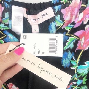 This is an off the shoulder swimsuit coverup dress by Nanette Lepore Swim! Black base with pretty colorful floral design. Pullover. Elastic top and waist. Tie front detail. Perfect for the pool, beach, cruise, or vacation!! Brand NWT!! Size Medium.