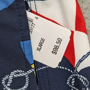 These are brand new $98.50 Brooks Brothers swim trunks. They feature a handsome nautical print on a navy background with an elastic and drawstring waist.