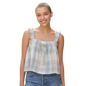 An American Eagle Outfitters Pastel Plaid Swing Cami Crop Top. Some photos vary in color due to lighting and source of picture. The colors are pale blue, green, pink, tan and off-white