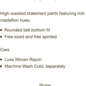 I bought them at a resort and never worn them. They are absolutely gorgeous pants. The softest rayon ever. Super unique and beautiful waistband. The big banded waistband will be very flattering for on. Smoke free home.