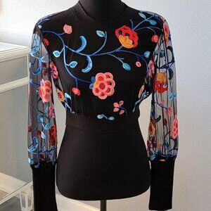 NEW COSMOPOLITAN x DRESS THE POPULATION MESH FLORAL BLACK LONG SLEEVE CROP TOP
