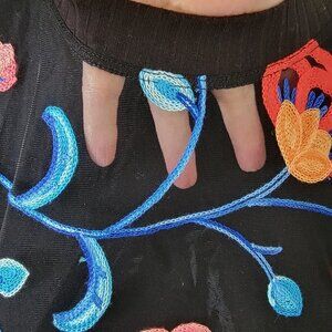 This is an alluring gorgeous sheer pullover crop with outstanding color against black see through mesh blouse trimmed in knit collar, waist and sleeves.