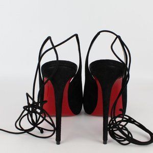 The Lace Up NVP pumps from Christian Louboutin are made in Italy from black suede and feature peep-toes, slender straps that wrap around the ankles, and signature lipstick-red soles.