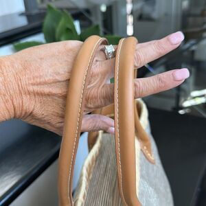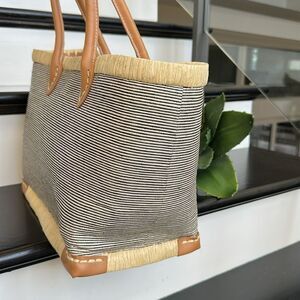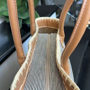 This brand new tote bag is from revolve and is perfect for the beach or to use as a shoulder tote. The bag has a slight shimmer to the fabric and a navy stripe. The rolled shoulder straps have an approximate 9 inch drop and the structured bag has a fold over snap closing pocket on one end… Perfect for your cell phone. This tote has a strong and secure zipper along the top, ensuring that your things are stored securely inside. The brand new bag opens to a finished the zipper pocket with designer name and a finished two compartment pocket for more organizing. Plenty of room inside this beautiful bag And would make an excellent gift for the season ahead. The signature starfish design is found on the front insuring this designer bag is easily identified. Classy and perfect to gab and go. Beach, market,shopping, handbag, gift!